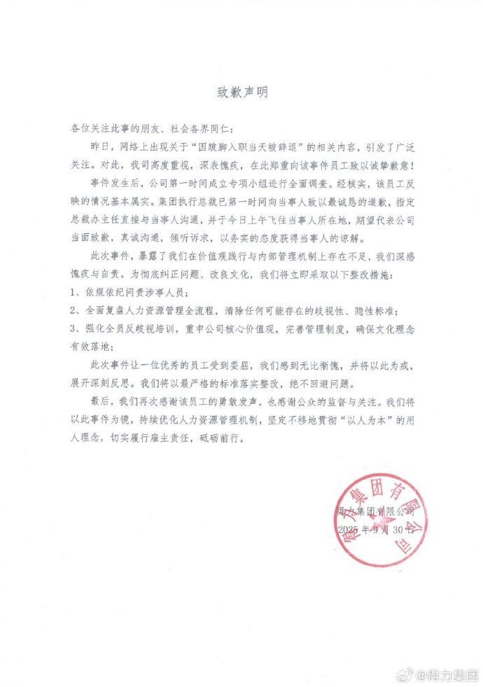 9月29日,有网友在社交平台发文称,今年5月初,自己通过得力集团的三轮面试后,在入职报到当天因为走路跛脚问题被HR辞退。随后得力集团CEO陈雪强在评论区留言致歉,表示将妥善处理此事。