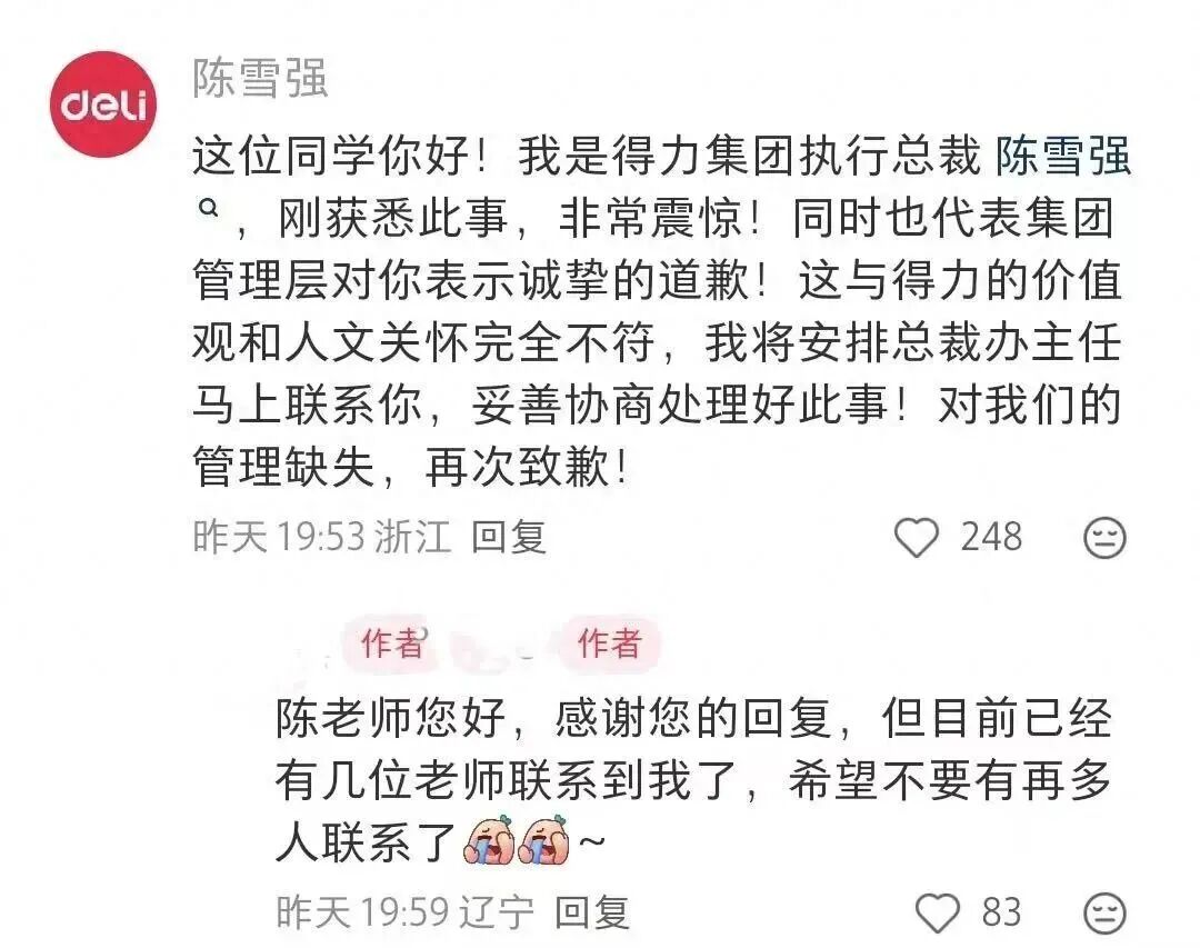 9月30日上午,得力集团客服人员向记者证实称,发布上述留言者确系陈雪强。关于该网友发帖反映的问题,得力方面已关注到,正在积极跟进处理,并核实相关情况。
