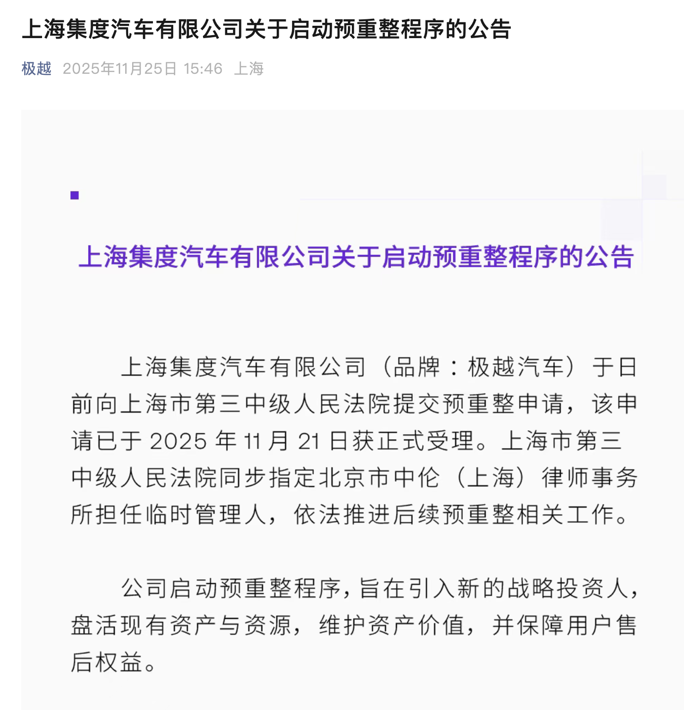 上证报中国证券网讯(记者 窦世平)上海集度汽车有限公司(品牌:极越汽车)25日公告称,公司于日前向上海市第三中级人民法院提交预重整申请,该申请已于2025年11月21日获正式受理。上海市第三中级人民法院同步指定北京市中伦(上海)律师事务所担任临时管理人,依法推进后续预重整相关工作。